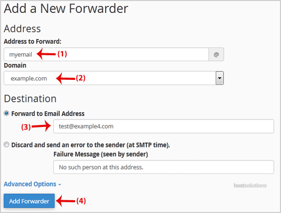Step 3: On the "Add a New Forwarder" page you will see the "Address to forward:" field. If you want to forward your [email protected] to your custom e-mail address, enter "myemail" (without the quotes) in the "Address to forward" field, and should you have multiple domains, select the appropriate one from the domain drop-down list.