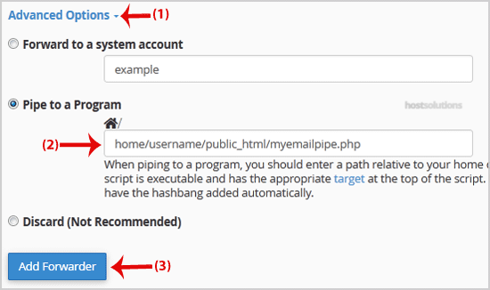 1. If you want to forward your email to an e-mail pipe script like myemailpipe.php, which is located on your public html folder like "/home/username/public_html/myemailpipe.php", follow Step 2 and Step 3.